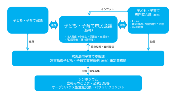 この取り組みの1つとして、こどもの権利を保証し、その健やかな成長を促しながら、地域全体で子育て世帯を支える仕組みを推進するための基本的な事項を定めた「宮古島市子ども・子育て支援条例(仮称)」の策定に取り組んでいます。