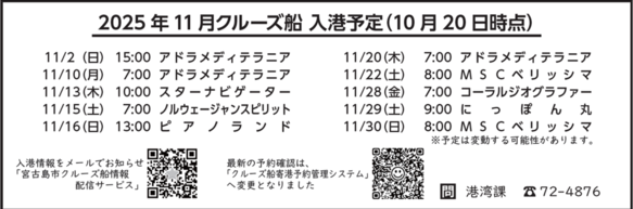 広報みやこじま(11月号)の11月のクルーズ船入港予定記事にて、