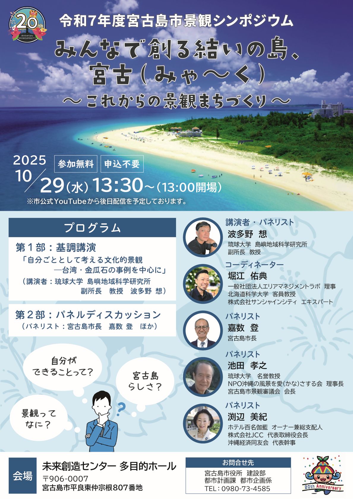 「宮古島市景観計画」や景観まちづくりについて、市民や事業者の方々の理解を深め、官民協働でこれからの宮古島市の将来像を考えるため、「令和7年度 宮古島市景観シンポジウム」を開催します。